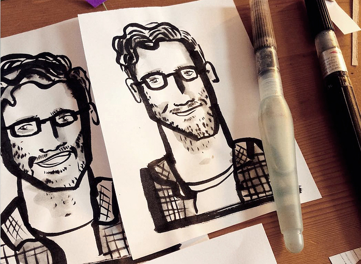 Auf Hochzeiten, Firmenevents, Messen und Familienfesten stelle Ich dieses Handwerk gern zur Verfügung. In Zeiten von Smartphone-Fotografie und Instagram, freuen sich alle über ein gezeichnetes Konterfei, dass nicht nur Aussehen, sondern vor allem Typ und Ausstrahlung erfasst. Ich arbeite mit Pinsel, Tusche und Aquarell auf hochwertigem Künstlerpapier. Gern beziehe ich Satzfetzen aus Dialog oder Situationskomik in meine Illustration ein. Eine Zeichnung dauert etwa 3−5 Minuten.