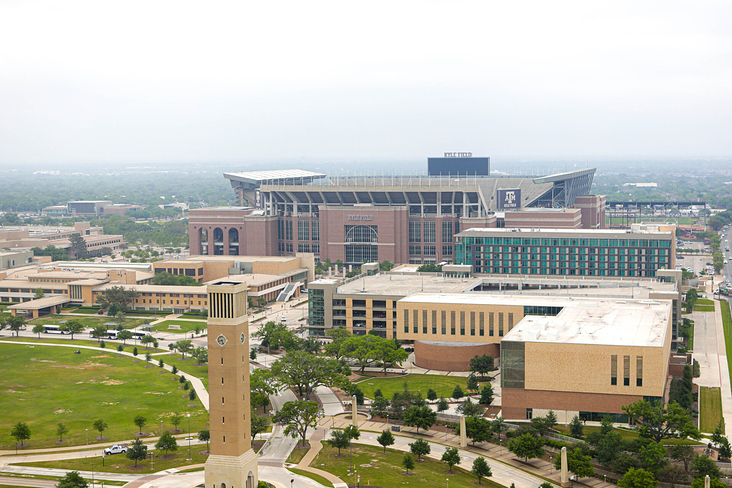 This aerial perspective shows the new classroom building at the heart of Texas A&M’s academic core, just steps from Kyle Fi