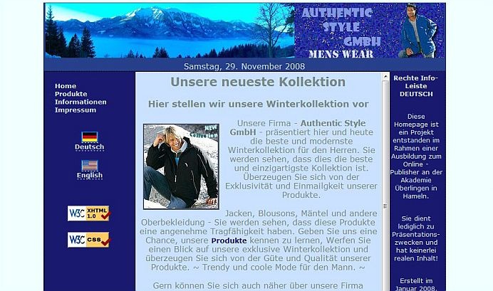 Eine komplett in PHP gestaltete Homepage, in XHTML und CSS gestaltet und standardkonform validiert. Selbsterstellte Grafiken, mit datenbankgestützem Kontaktformular, zweisprachig und mit einer kleinen Flash Präsentation